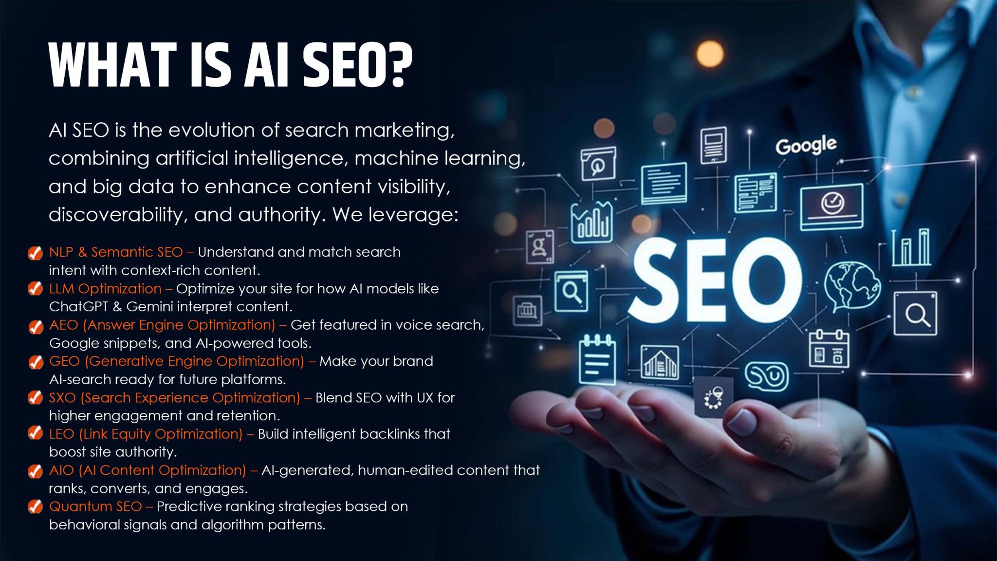 Traditional SEO is no longer enough. Welcome to AI SEO by Grow Business Leads, where cutting-edge technologies like Natural Language Processing (NLP), Large Language Models (LLM), and Semantic SEO meet powerful marketing strategies to push your brand beyond the first page of Google—into the future of search.